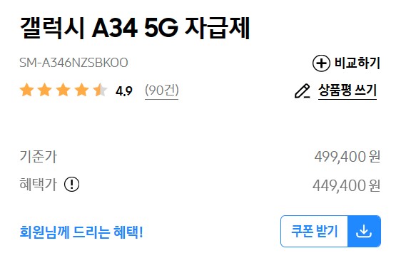 자급제 기준으로 설명드리면 현재, 삼성 공홈에서 5만원 할인 혜택을 받아 449,000원에 구매가 가능합니다.